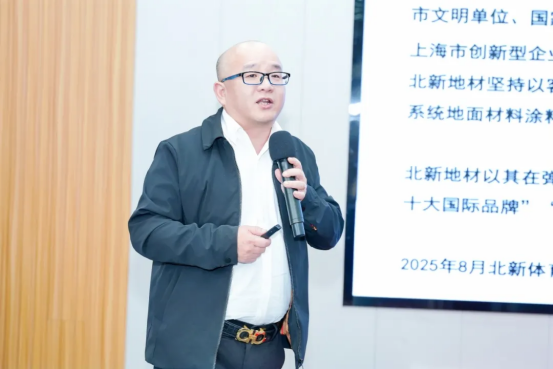 北新月皇地坪材料(上海)有限公司体育事业部杜之浩介绍了公司的概况、背景定位、产品体系。北新体育,央企信用,真材实料,杜总表示,公司将持续提供优质、专业的地面材料以及运动产品服务,同时更好推广体育文化,打造体育综合服务平台。