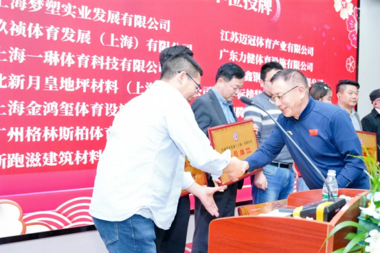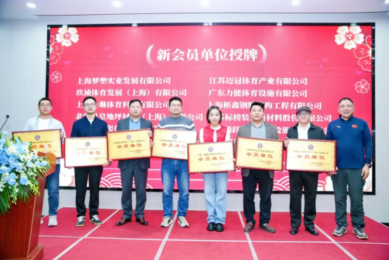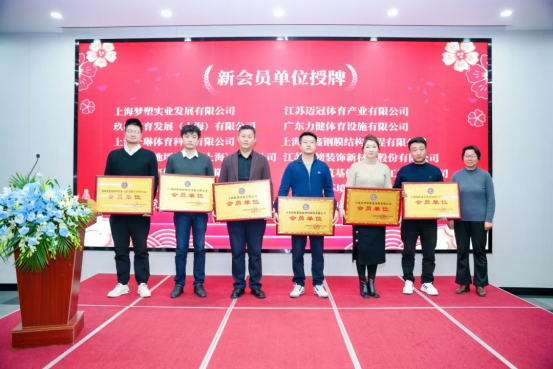 上海体育设施工程建设行业协会会长裴桂中为新会员单位:上海梦塑实业发展有限公司、江苏迈冠体育产业有限公司、玖祯体育发展(上海)有限公司、广东力健体育设施有限公司、上海一琳体育科技有限公司、上海彬鑫钢膜结构工程有限公司、北新月皇地坪材料(上海)有限公司授牌。