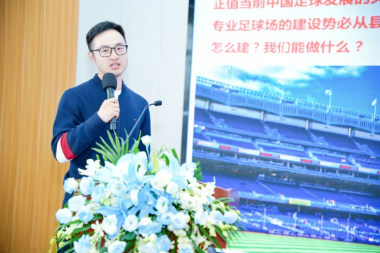 江苏迈冠体育产业有限公司总经理赵金余以《关于专业足球场建设的思考》为题展开分享。他谈到了在足球运动火热发展的背景下,适合国内的分级建设模型(地级市-县城)方案,以及考察国际球场的心得,此外他还展示了专业的行业服务内容和案例。