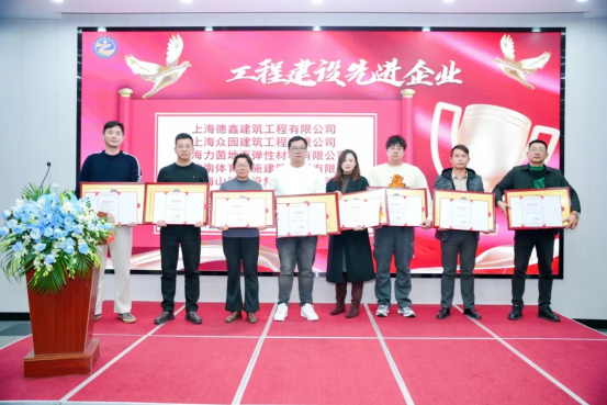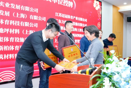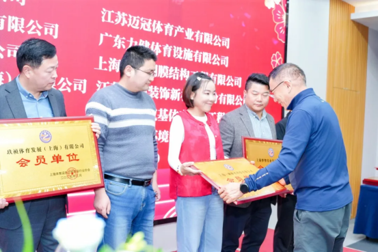 上海体育设施工程建设行业协会会长裴桂中为新会员单位:上海梦塑实业发展有限公司、江苏迈冠体育产业有限公司、玖祯体育发展(上海)有限公司、广东力健体育设施有限公司、上海一琳体育科技有限公司、上海彬鑫钢膜结构工程有限公司、北新月皇地坪材料(上海)有限公司授牌。